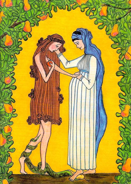 Eve’s head is bowed in shame, still clutching the apple, even as the snake crawls down from her leg. Mary offers her comfort, showing her the hope of the child in her womb, the head of the serpent crushed beneath her foot.